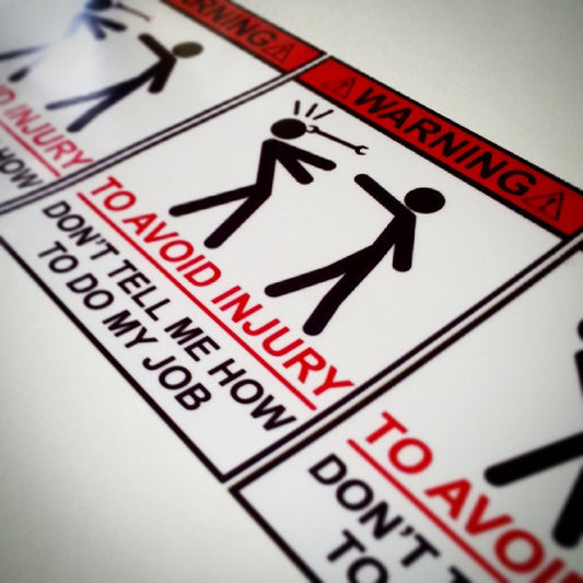 "WARNING don't tell me how to do my job" sticker.